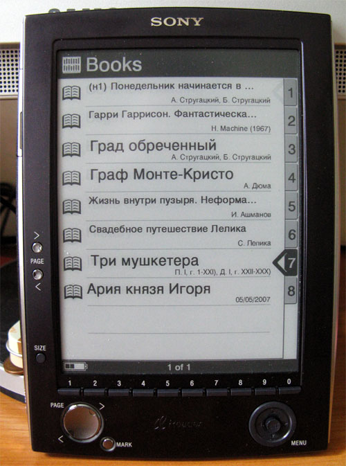 Приобрел наконец-то Sony Book Reader (писал о нем здесь). Вот она, эта прелес-с-с-с-сть... (Остальные предметы приведены для сравнения масштабов.)