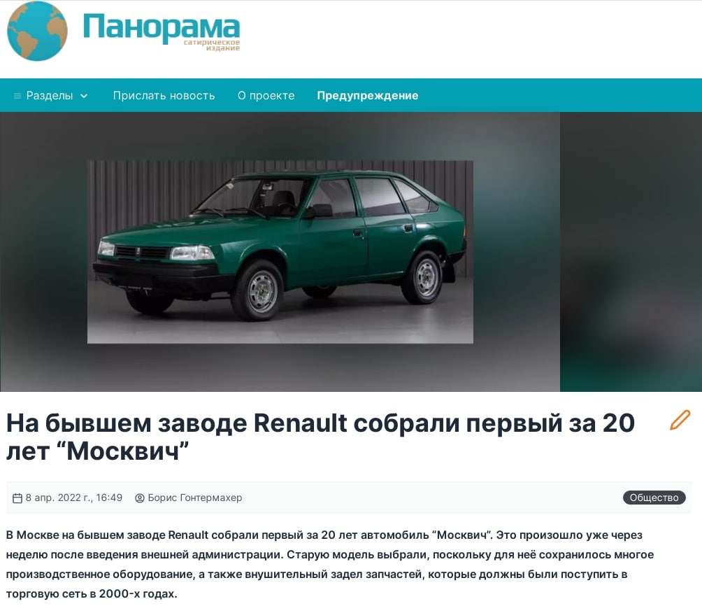 В свою очередь мэр Москвы Сергей Собянин объявил, что власти города решили возобновить производство легковых автомобилей под брендом «Москвич» на московском заводе «Рено», а также сохранить большую часть коллектива предприятия. (Отсюда.)