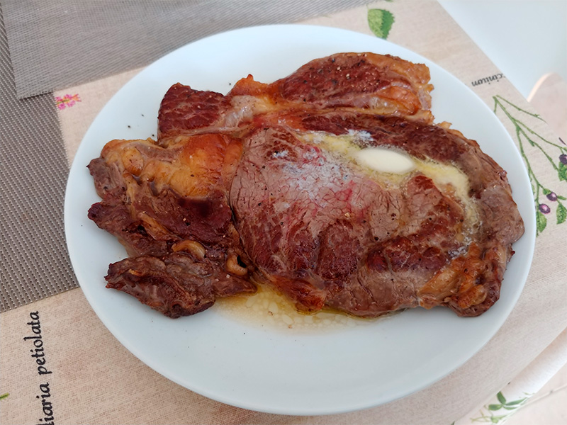 Да, погода испортила возможность что-нибудь пожарить на улице на гриле. Да, лёгкая простуда у 2/3 семейства испортила праздничное настроение как таковое. Но это не помешало мне все-таки сделать коронный чулетон и насладиться им. Чулетон получился - один в один как в ресторане, только блюдо обошлось в три раза дешевле. Кстати, напоминаю рецепт - для правильных кусков мяса толщиной сантиметра в полтора-два.