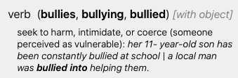 "Bullying is the use of force, coercion, hurtful teasing or threat, to abuse, aggressively dominate or intimidate".