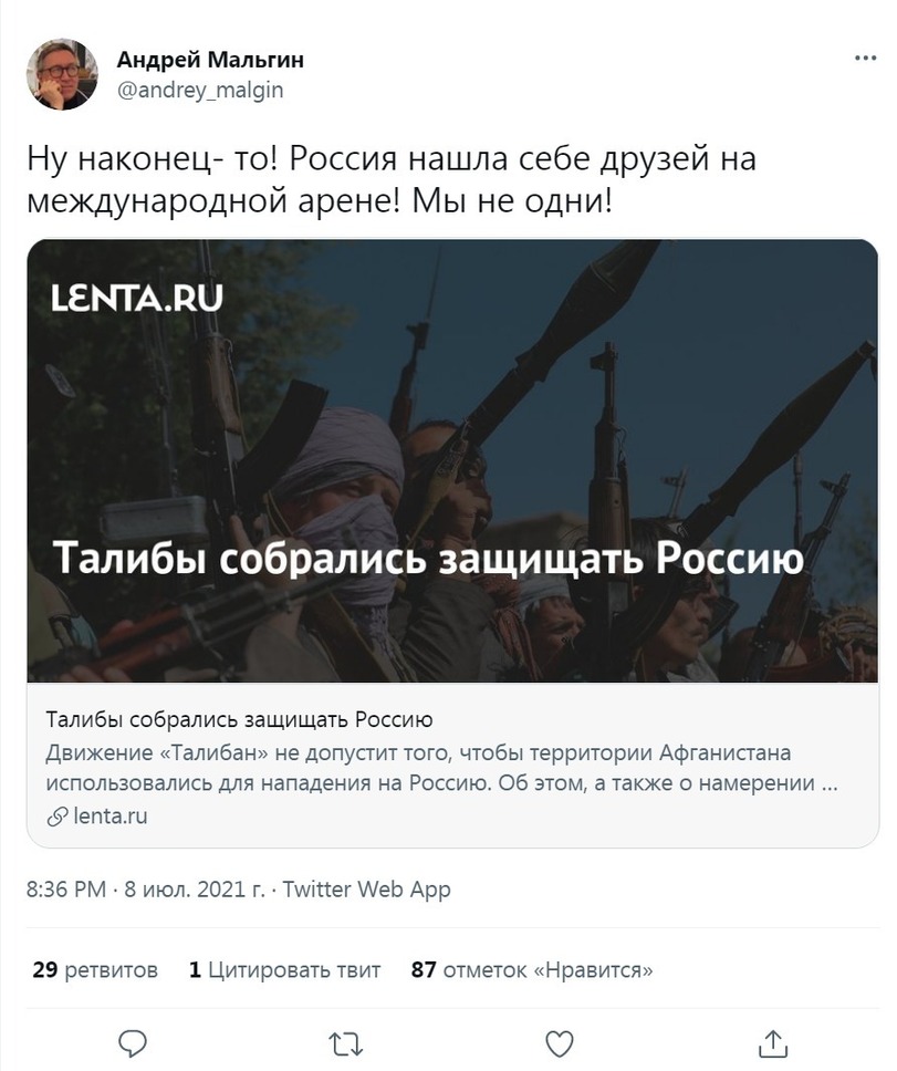 Вчера вечером слушал на "Дожде" одну из свежих программ. По этому вопросу как раз созвонились с одним распрекрасным дяденькой политолухом, специалистом по Ближнему Востоку при МГИМО и еще чего-то там. Первым аргументом дяденьки было "вседавноужетак делают - немыпервыминачаливестипереговорысталибами". Что касается закона об экстремизме, то он радостно сообщил, что этот закон касается только тех, кто планирует совершать свой экстремизм на территории РФ. А талибы - они не такие. Дяденька, видимо, забыл о том, как безо всякого экстремизма на территории РФ страна под предлогом войны с ИГИЛ вторглась в Сирию (братаясь там с Хезболлой) и как шизофренический СК возбуждается на вымышленные события и фейки в Украине.