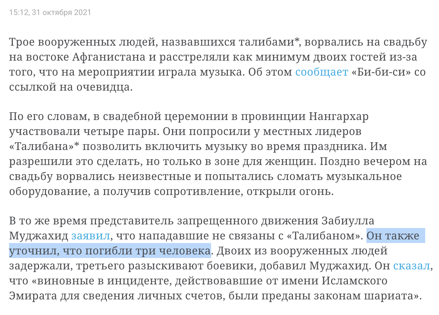 Хм. Гардиан: Gunmen kill at least three at Afghan wedding to stop music being played. Taliban government spokesman Zabihullah Mujahid said on Saturday that two of the three attackers had been arrested, and denied they were acting on behalf of the Islamist movement.