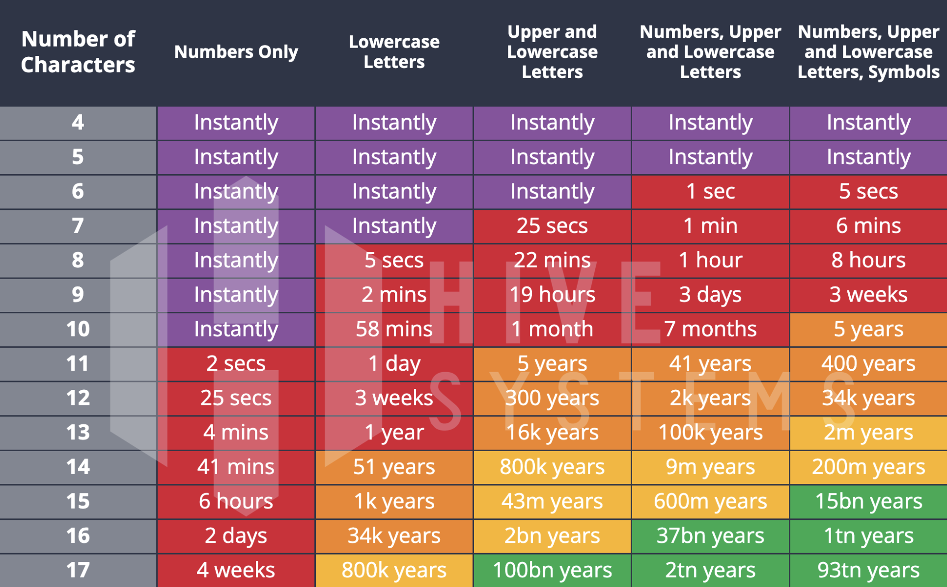 Ниже примерная скорость взлома для паролей разного типа и разной длины (табличка уже на год устарела, но примерные сроки за это время изменились ненамного):