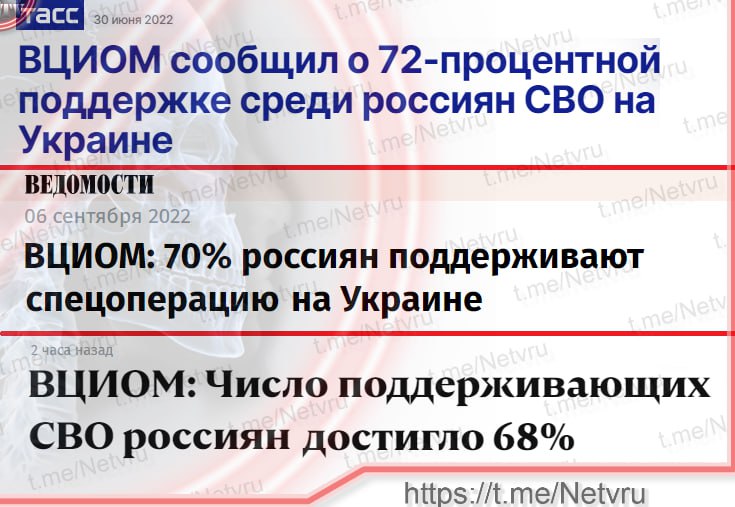 Впрочем, оно прекрасно понятно, что официальный опрос, да еще и в условиях, когда за одно слово против войны (и за само слово "война") человека реально могут упечь на несколько лет в тюрьму - его результаты будут предельно недостоверными, и всем таким опросам и их результатам - грош цена.