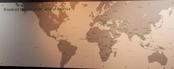 На нижеследующем плакате представлены города и страны, где вещает VOA.