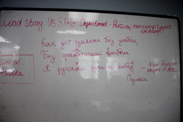На стене русской редакции висят вот такие вот трогательные стихи великага русскага поэта Пушкена.