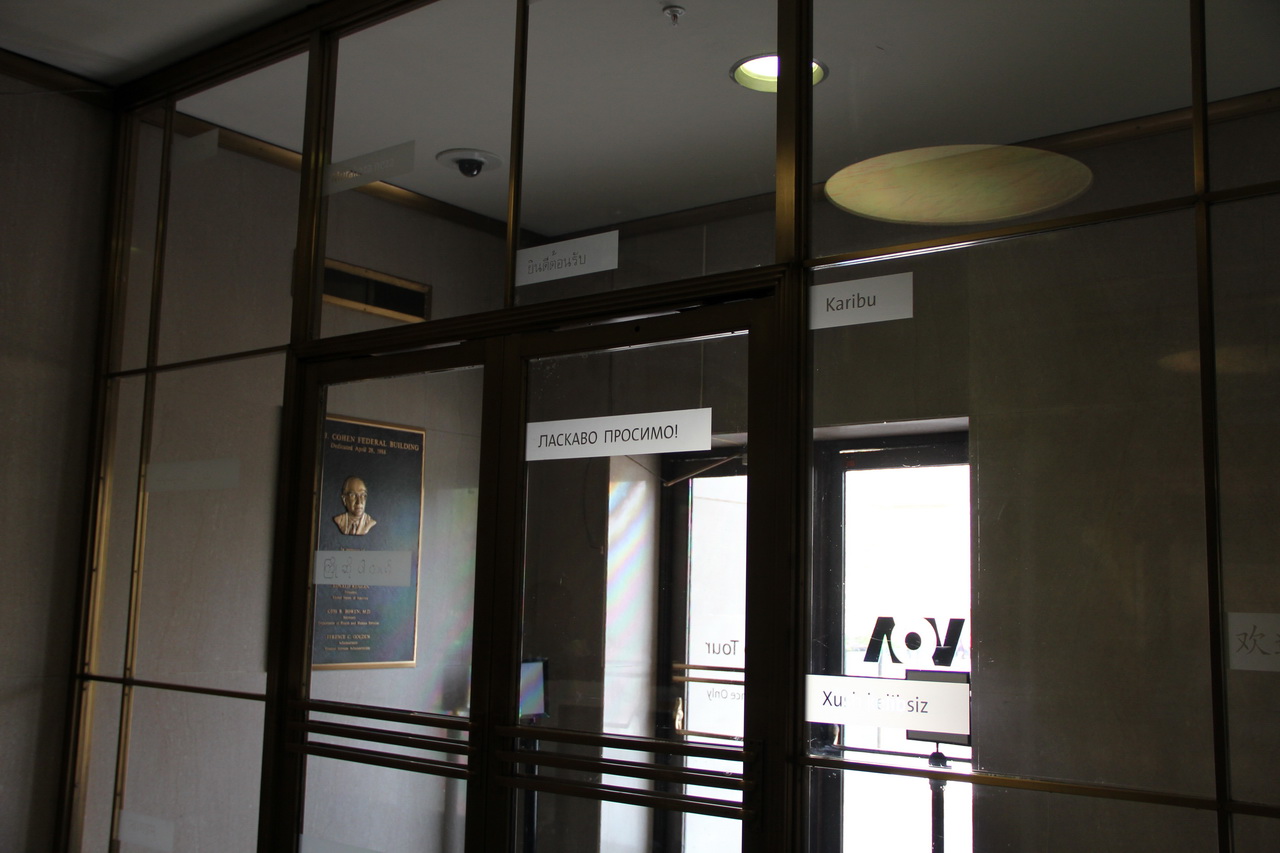 На дверях VOA размещены приветствия на большинстве языков вещания. Что характерно, приветствия на русском - нет. Но зато есть приветствие на украинском.