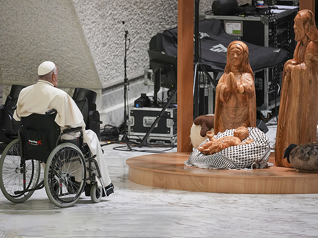 В Ватикане состоялась церемония представления рождественского вертепа – скульптурной композиции, изображающей рождение в Вифлееме Иисуса Христа. В нынешнем году она была изготовлена мастерами из Бейт-Лехема, и младенец Иисус возлежит в яслях на куфии – палестинском платке, известном также как "арафатка".