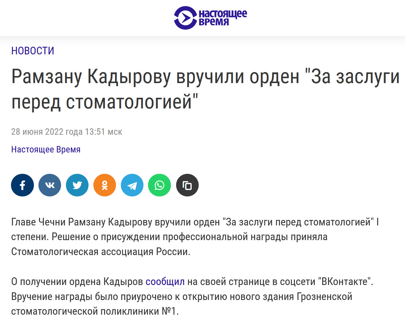 «Я с большим удовольствием принял из рук Михаила Валентиновича медаль имени И.В. Курчатова за выдающийся вклад в развитие НИЦ «Курчатовский институт». Для меня большая честь получить такое высокое признание от именитого института», — написал почётный член Российской Академии естественных наук* Рамзан Кадыров у себя в канале.