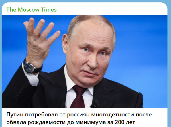 Как известно, товарищ Путин дал россиянам жесткий наказ - плодиться и как следует размножаться. Товарищ Путин не скрывает, что ему понадобится еще много пушечного мяса. У товарища Путина большие планы по утилизации недорогих россиян.