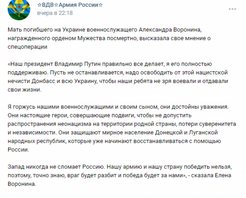 У этих существ Путин хоть всех сыновей может спалить в топке этой абсолютно безумной войны - пофиг: все равно будут с пустыми глазами повторять эти бредни из телика про "денацификацию", Запад и так далее. Хоть всех сыновей у них уничтожь. Кроме того, каждый убитый сынулька - это новая "Лада" или погашение ипотеки, понимать надо. Ребята не зря отдали свои жизни, факт. Западу тут ничего и ломать не надо: сами себя закопают, продолжая орать про импперское величие.