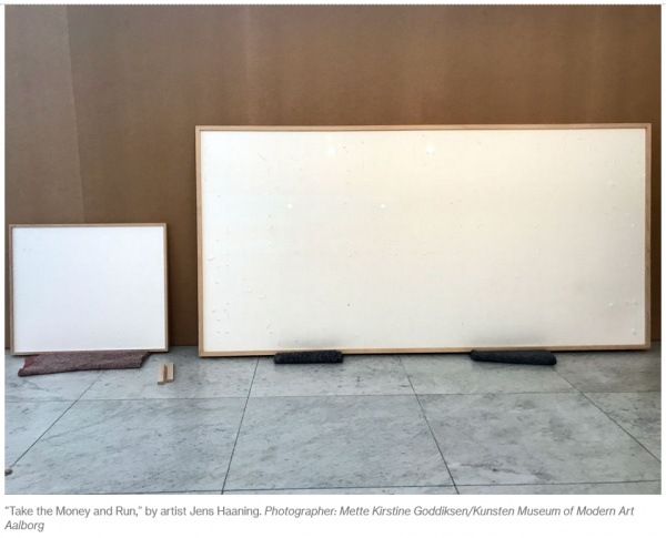 Пересказ сути событий. Датский художник Йенс Хаанинг взял в долг деньги у музея современного искусства Кунстен (он расположен на севере Дании в Ольборге), чтобы повторить свою концептуальную работу, в которой на двух стендах выставлялись годовые доходы австрийца и датчанина, причем деньги там были настоящие. Музей ему выдал сумму, эквивалентную 84 тысячам долларов, но когда Хаанинг прислал работу, оказалось, что в стендах ничего нет, а название работы - "Бери деньги и беги".