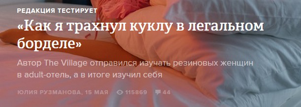 Как можно было писать репортаж о том как ты _трахаешь куклу_ в _легальном борделе_ в _Москве_ - без капли иронии вообще - вот это мне непонятно совсем. Ну и зачем, тоже непонятно. Если бы это еще джинса была - так нет, он бордель этот конкретно обосрал.