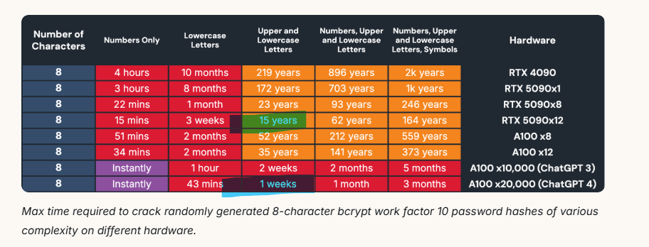 Компания Hive Systems, занимающаяся кибербезопасностью, опубликовала таблицу взлома паролей за 2025 год, построенную на основе имитированной атаки с использованием 12 графических процессоров Nvidia RTX 5090.