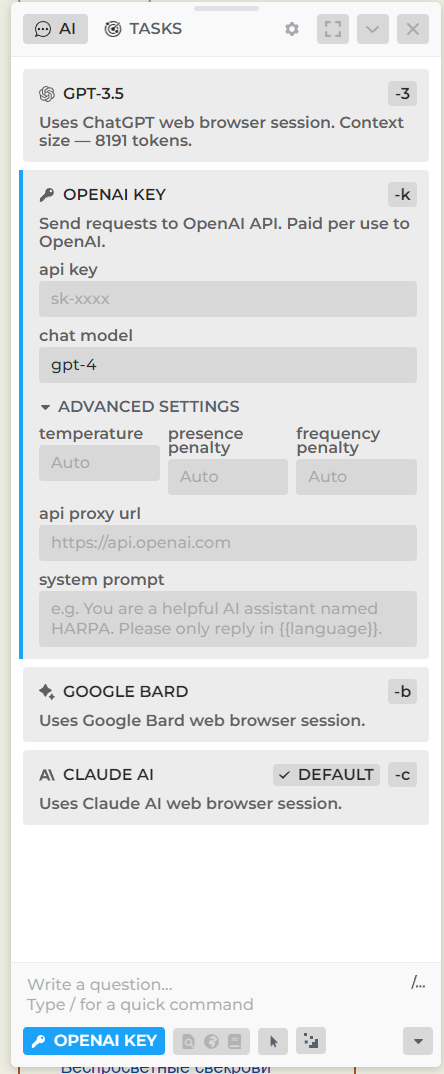 Я после долгих экспериментов перешёл на HARPA AI. Это chrome extension, который умеет ходить в ЖПТ, Барта, и Клода (который я в последнее время очень уважаю).