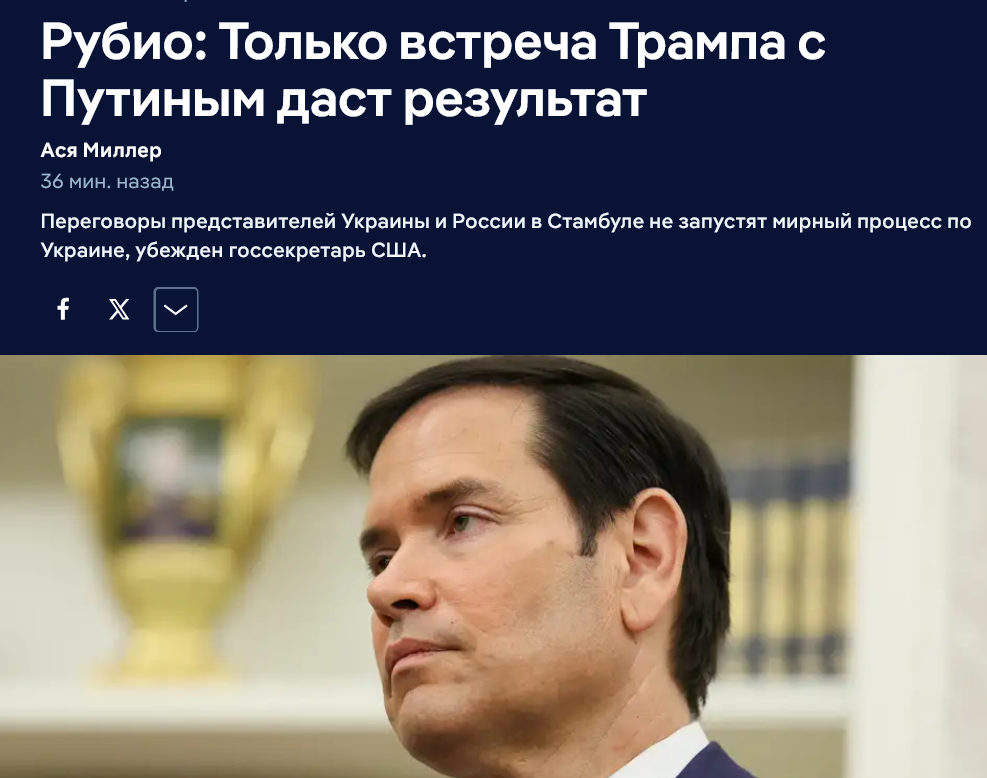 По словам Рубио, США 16 мая проведут переговоры с Фиданом и украинской делегацией, после чего можно будет принять решение о дате возможной встречи президентов США и РФ Дональда Трампа и Владимира Путина. Госсекретарь США подчеркнул, что единственный способ добиться прорыва в дипломатическом процессе - обеспечить в нем личное участие Трампа и Путина.