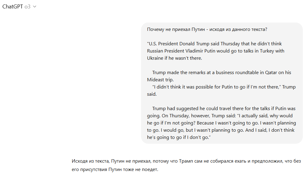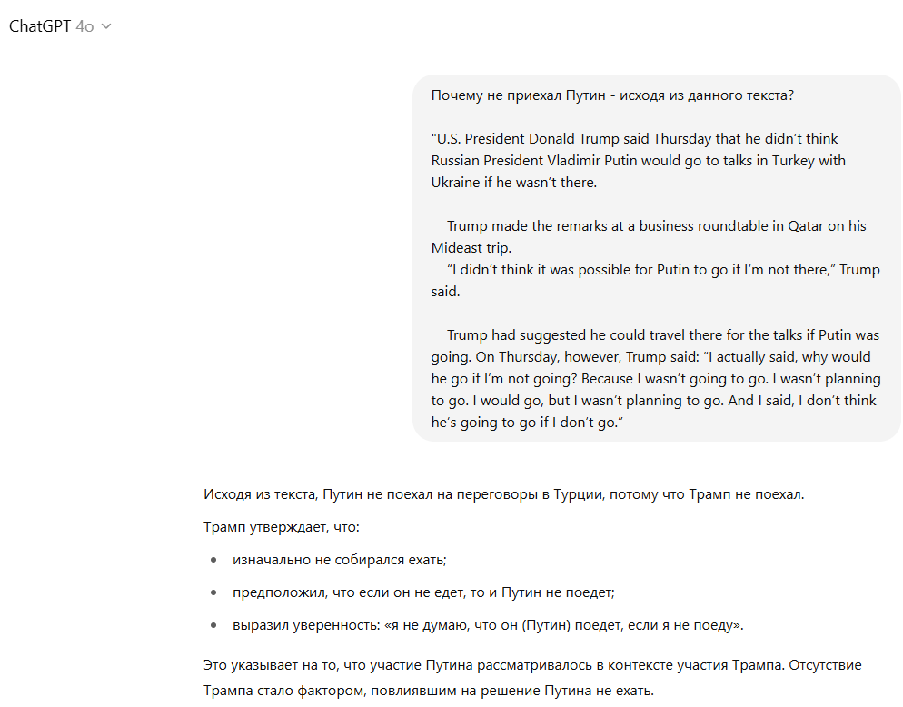 Нейтральный, так сказать, анализ от чатика. А то вдруг мы английский не знаем, а Трамп имел ввиду что-то другое. Или может мы предвзято наговариваем - видя в тексте то, чего нет? Но нет, чатик видит то же самое. Выходит, Трамп уже второй раз отдает все "карты" - и превращает в пшик все идеи по давлению. Сначала он испортил согласованную предварительно идею совместного ультиматума от коалиции, насчет тридцатидневного перемирия - и вместо поддержания санкций уже с понедельника, заставил Зеленского ехать на клоунские переговоры ни о чем. Сейчас тоже фактически отмазал Путина - это, выходит, не он забил на переговоры/струсил, а просто ему и не было смысла приезжать. В очередной раз становится трудно удержаться от мысли о том, а не работает ли Трамп на Путина - изо всех сил помогая дружбану тянуть время?