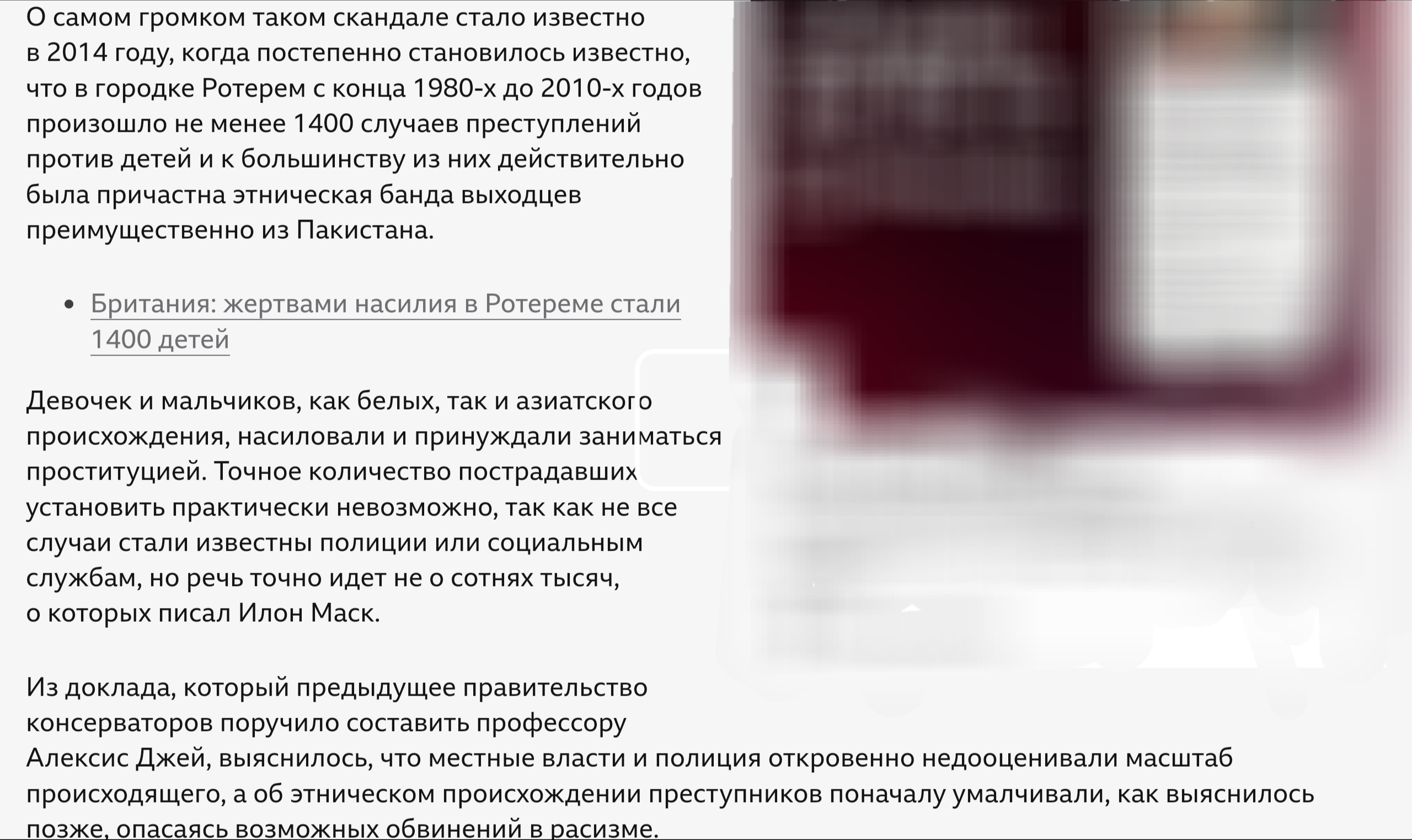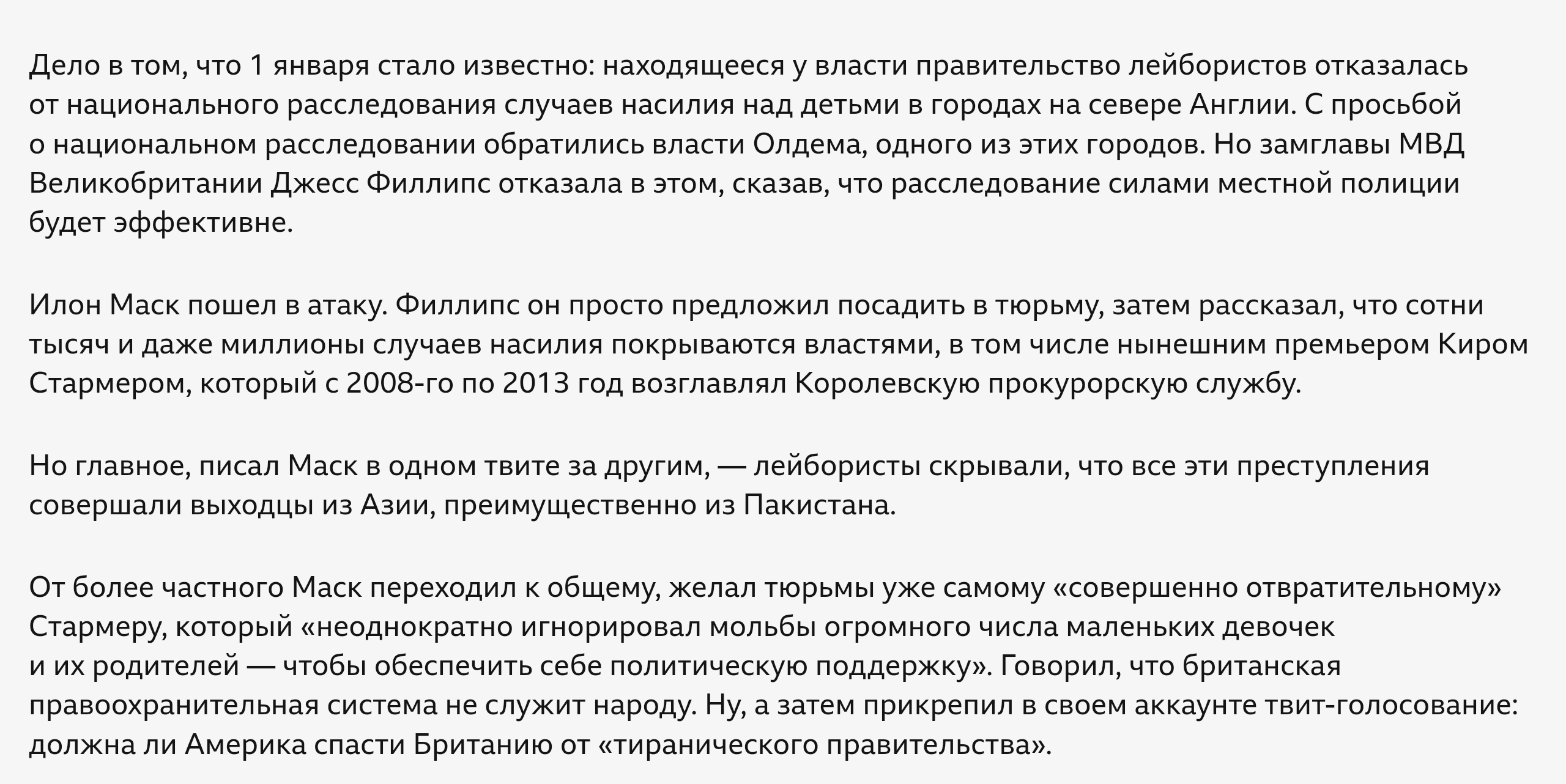 А Маск говорит о фактах - массовом насилии над тысячами детей этнической пакистанской бандой иммигрантов при попустительстве британских властей.