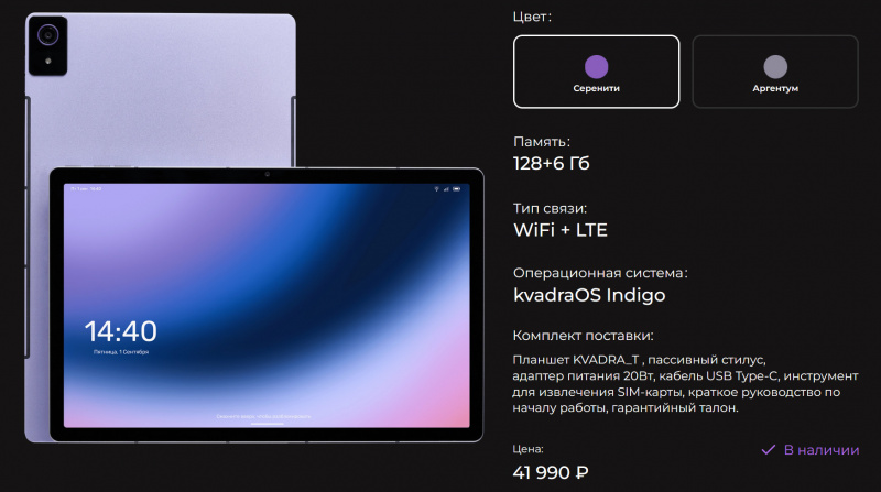 "Планшет оснащён обновлённой версией мобильной операционной системы kvadraOS, внесённой в реестр Минцифры"