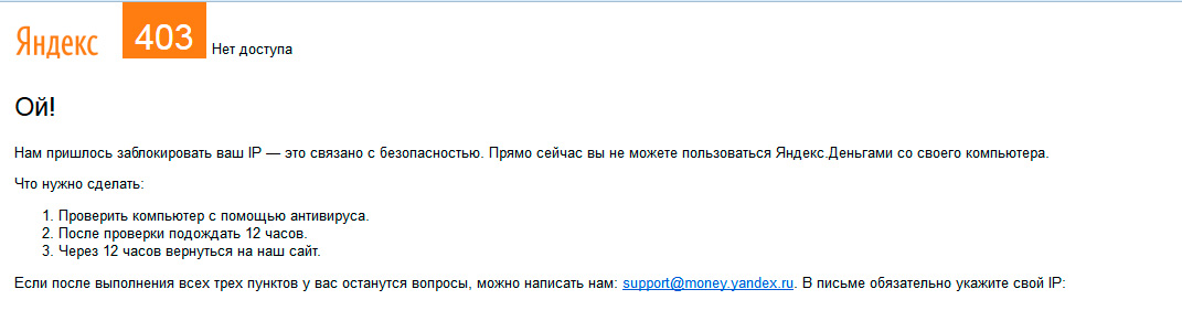 Алекс, привет, да, такое происходит при массовых запросах с IP-адреса. Если IP динамический, бывает, что прилетает скомпрометированный «от соседа», тогда чаще всего достаточно просто обновить сессию. Если статический — убедиться, что у вас на устройстве нет никакой заразы. Обычно такая блокировка действует несколько часов, если у вас по-прежнему 403 ошибка (или проблема повторяется) – напишите мне, пожалуйста (указав IP, с которого не можете попасть на сайт), на smm@yamoney.ru, мы обязательно поможем.