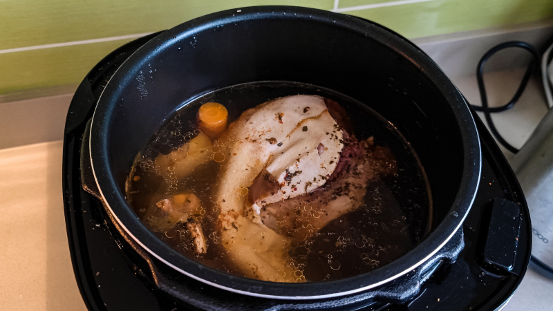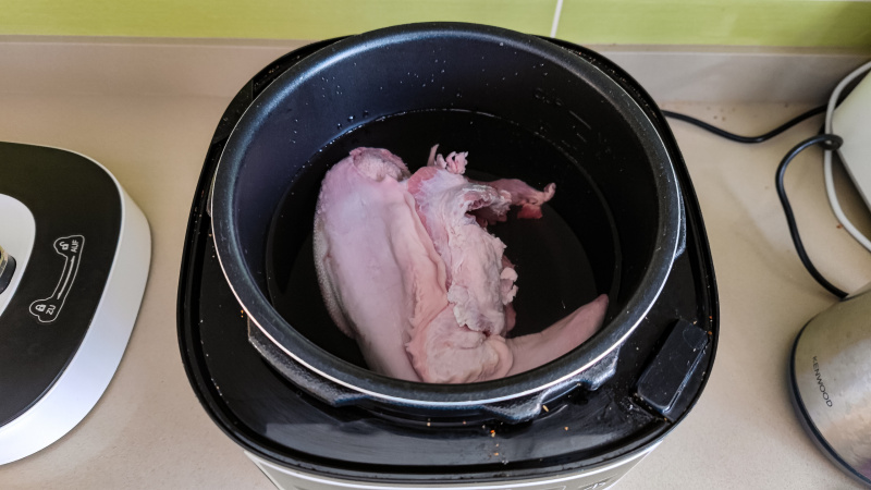 Залил кипятком, чтобы язык был покрыт целиком, поставил на тушение под давлением на 45 минут. И после приготовления дождался, когда давление пара спадет само (еще 15 минут).
