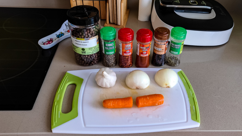Для готовки положил в емкость с языком одну луковицу, одну морковку, одну головку чеснока, разрезанную поперек. Специи: соль, острая паприка, кайенский перец, черный перец горошком, душистый перец, прованские травы, сухой базилик.