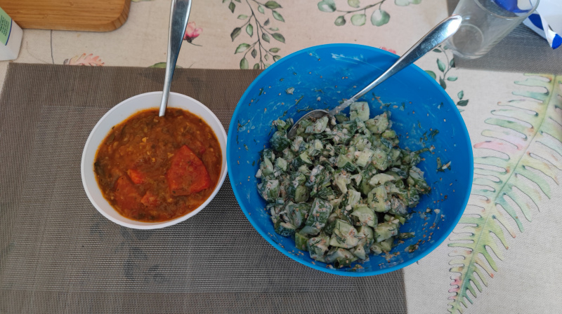 Салат из огурцов с зеленым луком, укропом и чесноком, заправленный ложкой сметаны. Плошка овощного рагу собственного приготовления.