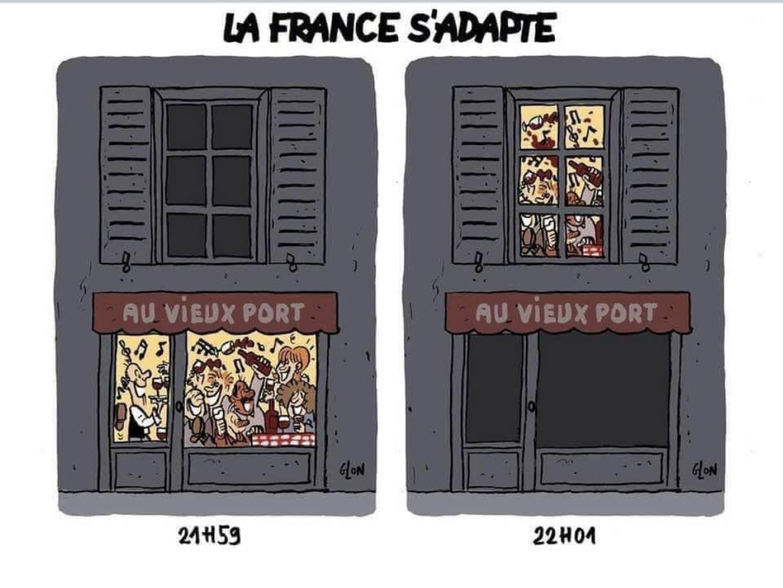 Подпись к карикатуре "Франция адаптируется". Собственно, это сейчас и происходит повседневно что во Франции, что в Бельгии )