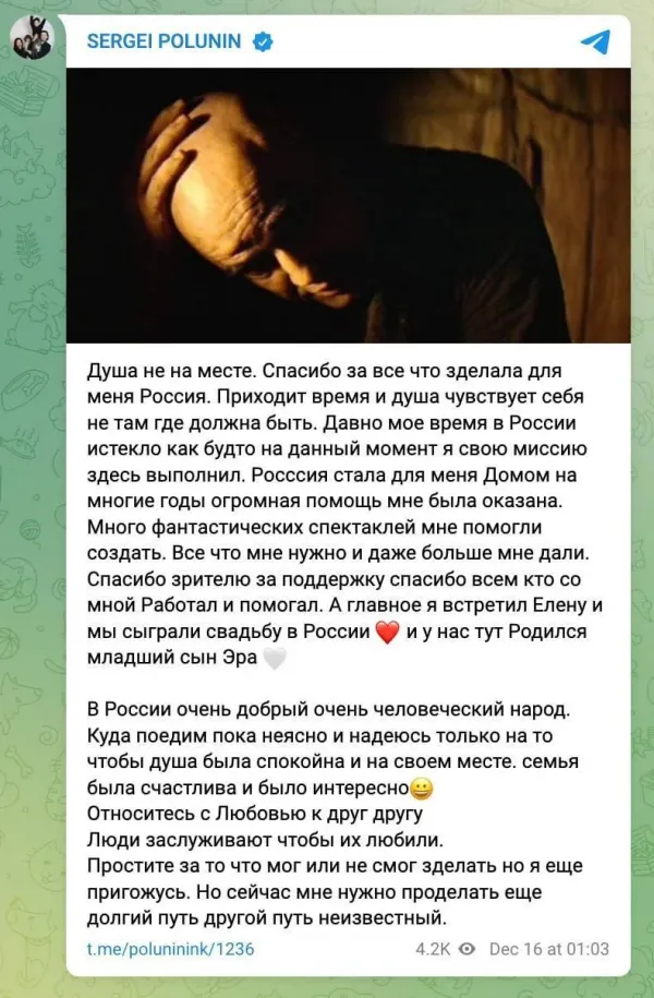 И вот сегодня Полунин написал в своем ТГ. У него, понимаешь, душа чувствует себя не там, где должна быть. В России очень добрый человеческий народ. Но все равно Сережа вот только поест - и поедет куда-нибудь, где душа должна быть. Ему надо проделать еще долгий другой путь неизвестный.