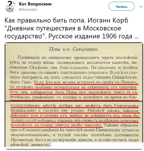Таксист рассказывал байку: Отпевали они в церкви родственника. Стояли с молодым попом молились. У попа зазвонил телефон, он извинился достал из под сутаны, показав крутые шорты и кроссы, мобилу отошел поговорил. Вернулся. Все спокойно дождались, домолились. Потом мужики отвели попа за храм поговорить и побили. Снимали при этом с него Скуфью или нет не упоминали. 😄