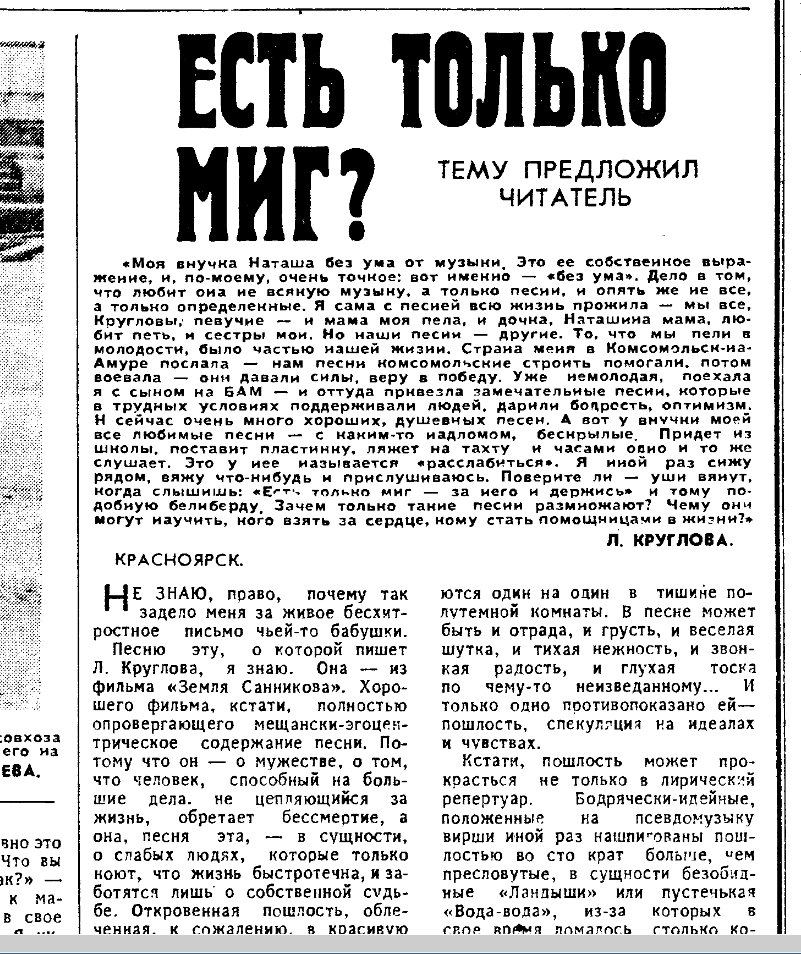 О! Я помню, как в Советском Союзе критиковали эту песню. Как это так - "есть только миг"?! Как это так - "призрачно всё"? А как же наше великое прошлое? Наши великие свершения, наша великая революция, в конце концов! А наше светлое будущее - коммунизм?! Чему учит песня нашу советскую молодежь? Жить сегодняшним днем, не помнить подвиги дедов и отцов и не отдавать все силы делу коммунизма!