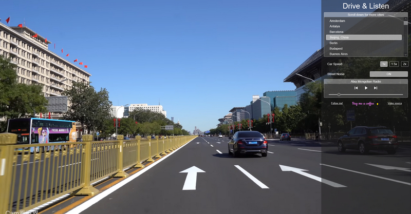 Любопытный проект - Drive&Listen. На странице в колонке справа можно выбирать город из списка, менять скорость машины, включать/выключать звуки улицы, включать/выключать радио. Покатался по разным городам - очень забавно. Список городов, правда, пока не такой большой.