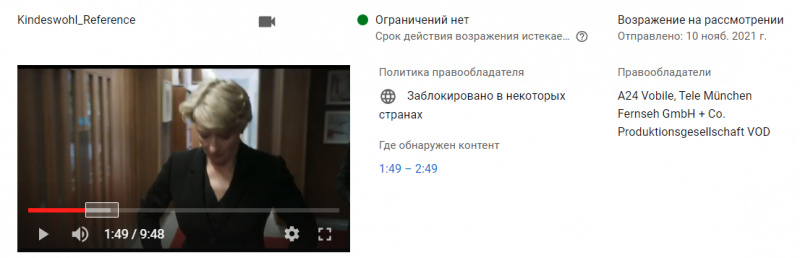 Иду смотреть, кто и на что жалуется. Какая-от немецкая компания жалуется на одну минуту ролика, где идет видеовставка из британского фильма. Причем с чего вдруг они жалуются - непонятно совершенно.