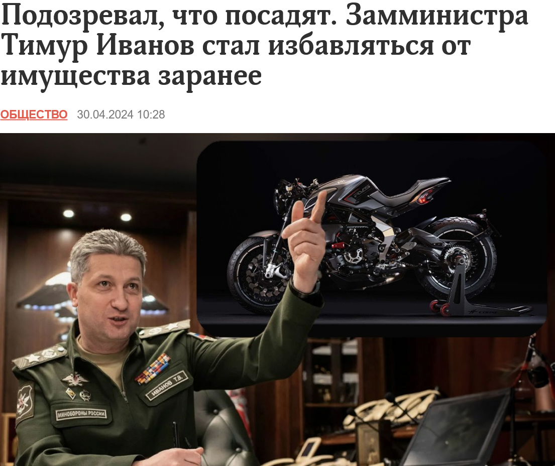 А вот версия журналиста Сергея Асланяна, которую он высказал в интервью украинскому "Каналу 24" (примерно с отметки 38:30). Сергей тоже считает, что Шойгу ничего не угрожает, а Иванова арестовали потому, что он позарился на оставшиеся после Пригожина африканские активы (весьма лакомые), которые между собой дербанили феэсбешники. Ну и в ФСБ решили, что Иванов "берега потерял", после чего добились от Путина разрешения на его арест. И теперь его вместе с подельниками (включая совершенно случайных) образцово-показательно закопают, чтобы неповадно было. И версия со "взяткой", которая звучит совершенно издевательски, выбрана специально.