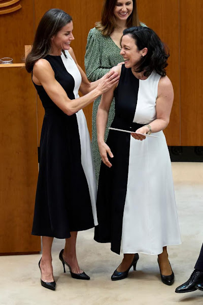 Различные испанские СМИ (например, вот это) пишут о забавной истории, произошедшей во время церемонии вручения «Награды королевы Летисии» в Мериде. Ее Величество вручала одну из наград профессору гражданского права Университета Севильи Инмакуладе Вивас. И надо же было такому случиться, что королева и сеньора Вивас оказались одеты совершенно одинаково: в черно-белое платье от Мango за €50.