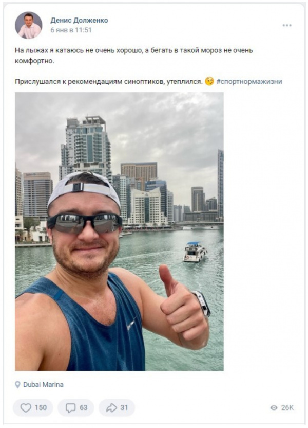 Однако нечуткие люди в издании SOTA разглядели на фото название бутика Louis féraud, которого отродясь не было в Вологде, зато их аж пять штук в Дубае, а при этом тот же Долженко прям уж совсем неосмотрительно за день до этого выложил свое селфи в Дубае.