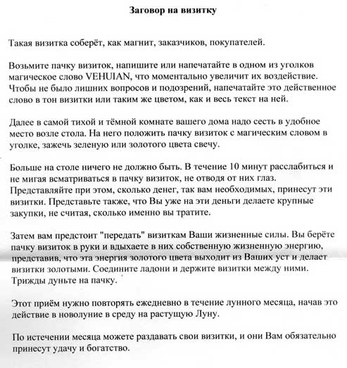 Рассказал человек, работающий в фирме, которая изготавливает визитки. Несколько человек приходили заказать визитки и требовали, чтобы на них было напечатано слово VEHIUAN. Люди совершенно разные и, на первый взгляд, не сумасшедшие. На вопрос, зачем на визитке писать какую-то вехуианную фигню - один из них показал листовку. Вот эту.