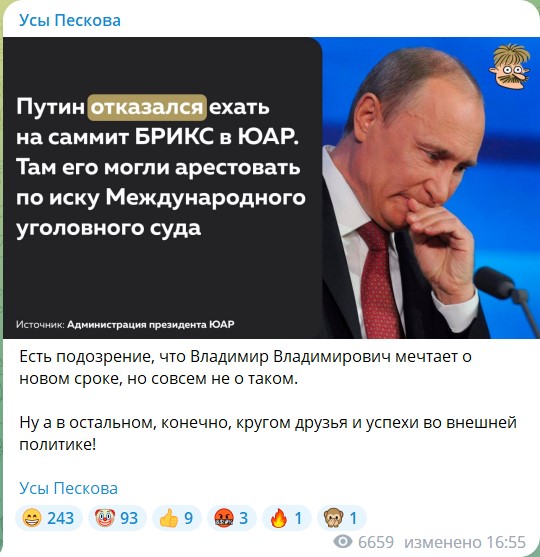 Владимир Путин не поедет на саммит БРИКС в Йоханнесбург, российское государство представит на нем глава МИД Сергей Лавров.
