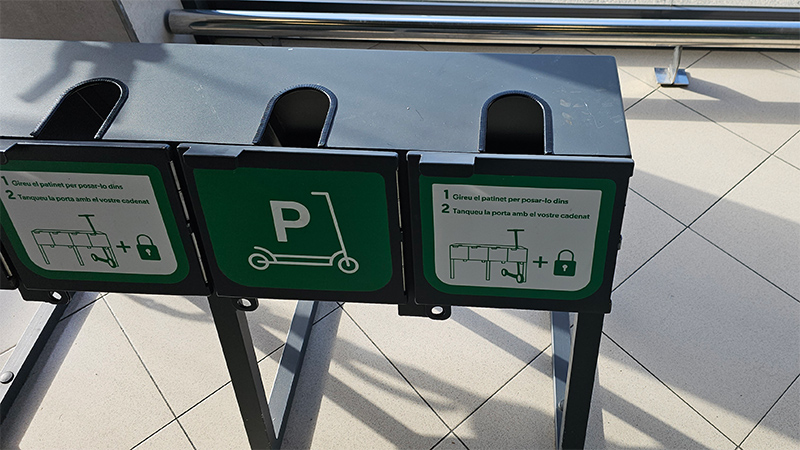 И только сегодня я случайно выяснил, в чем дело. Я просто в "Меркадону" всегда захожу со стороны парковки, потому что до нее нужно ехать на машине, а там есть еще вход со стороны проезжей части. Так вот, оказалось, что в тамбуре входа со стороны улицы поставили вот такие замки для электросамокатов. Ставишь, закрываешь на замок, ключ уносишь с собой. Кроме того, по "Меркадоне гуляет охранник, который за самокатами также приглядывает.