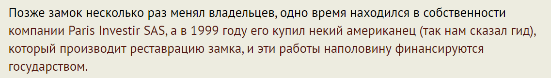 Позже замок несколько раз менял владельцев, одно время находился в собственности компании Paris Investir SAS, а в 1999 году его купил некий американец (так нам сказал гид), который производит реставрацию замка, и эти работы наполовину финансируются государством.