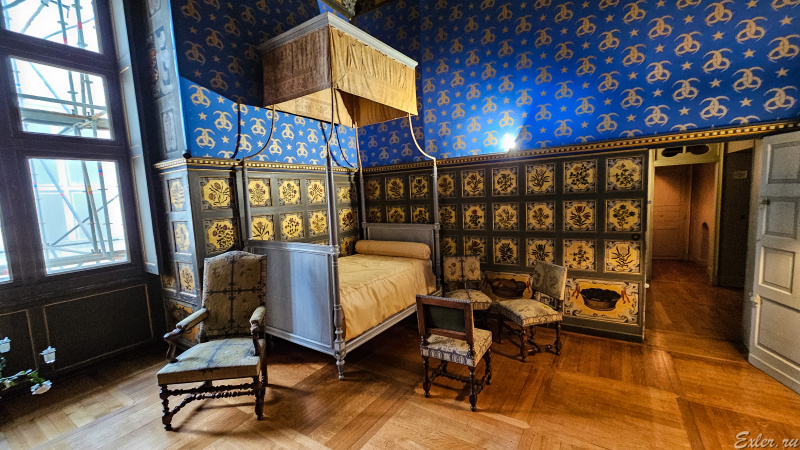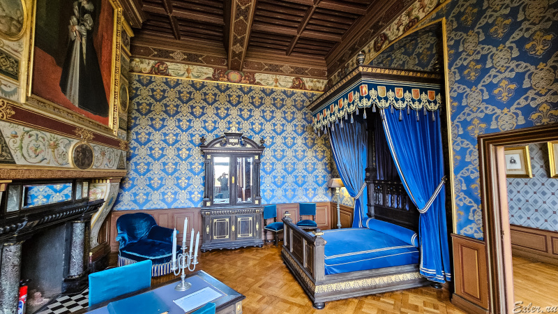 Спальня одной из владелиц замка. Она рано потеряла мужа и пять лет носила траур по нему: темно-синее платье на ее портрете - знак этого траура.