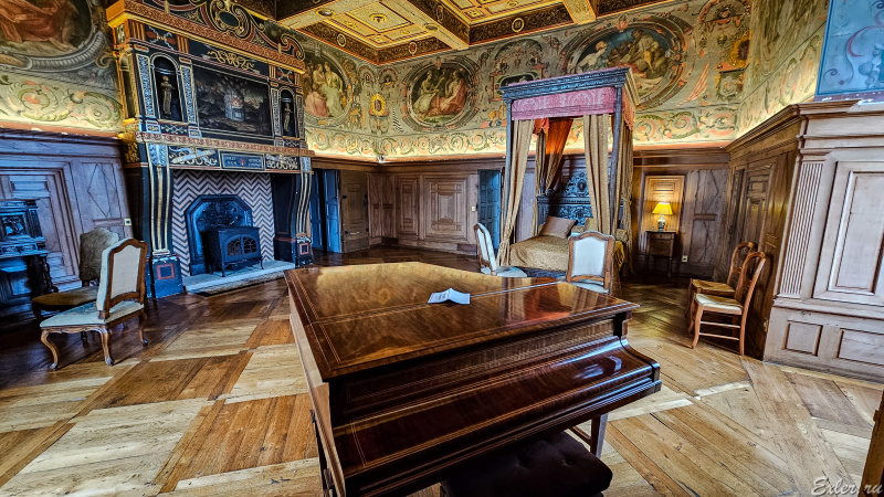 Еще одна спальня с камином и роялем. Ну любили они перед сном помузицировать.