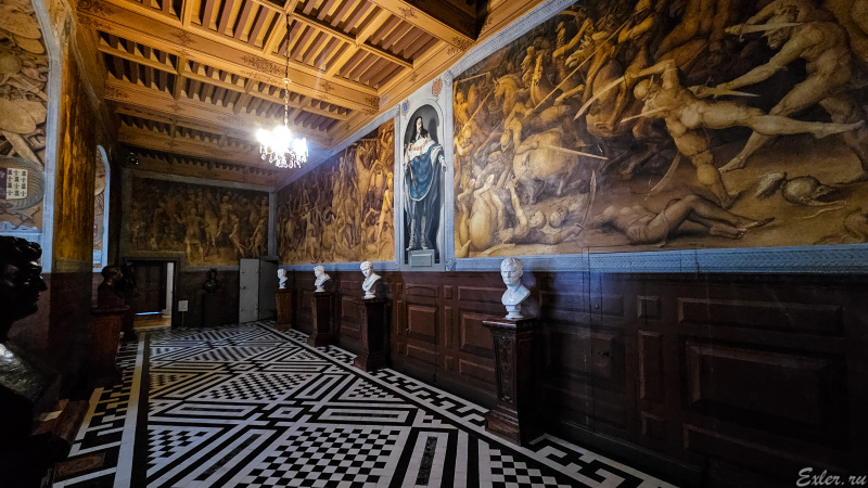 Галерея Ферсале, где принимали посетителей. Фрески, выполненные охрой, изображают  битву, в которой войска Цезаря сражались с войсками Помпея. Между фресками находилась фигура Цезаря, однако она была утрачена, после чего туда зачем-то водрузили фигуру Людовика XIII - а чтоб было!