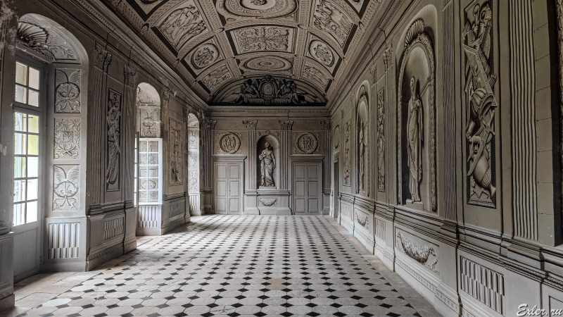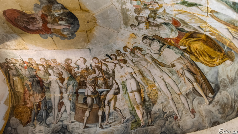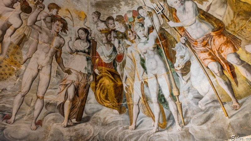 И последнее помещение, где разрешают снимать - тайное место встреч гугенотов в верхнем помещении башни левого крыла. Потолок помещения украшен мистической фреской с изображением тогдашней политической ситуации во Франции в образах античных богов. Левая часть фрески с изображением католиков была закончена, центральная часть с Генрихом II в виде Януса и Екатериной Медичи в виде обнаженной Венеры - также была закончена, а часть, где были изображены гугеноты - так и не была завершена.