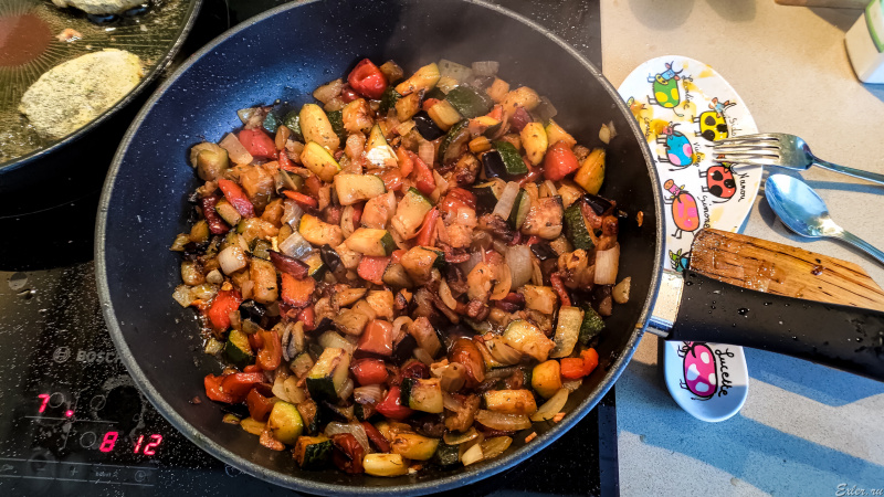 Провел эксперимент. Взял те же продукты, точно так же порезал. В волшебном горшочке обжарил лук с чесноком, покидал все овощи туда скопом, добавил сухой чеснок, красный сладкий перец, прованские травы, хмели-сунели, перемешал, выставил на 5 минут на тушение под давлением пара. (Опытным путём давно выяснил, что 5 минут под давлением для овощей - достаточно: так они становятся мягкие, но сохраняют форму и структуру, не расплываясь в кашу.)