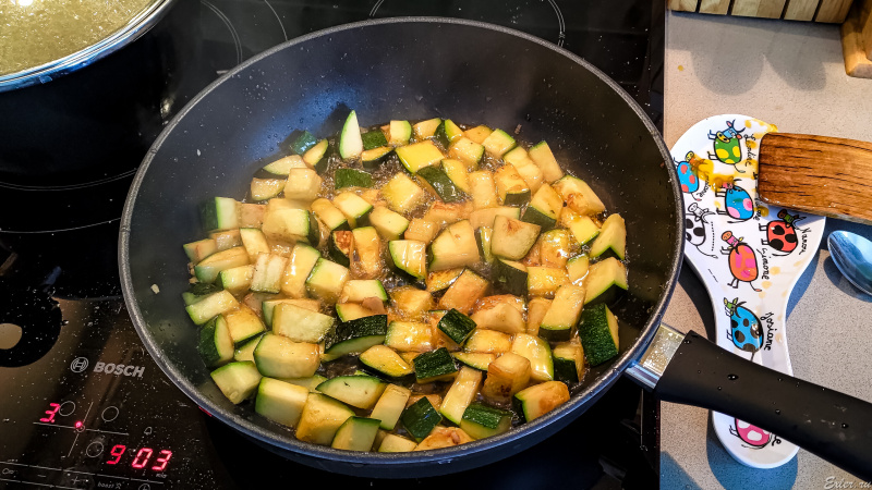 На том же масле обжарил лук, в нем обжарил баклажан.