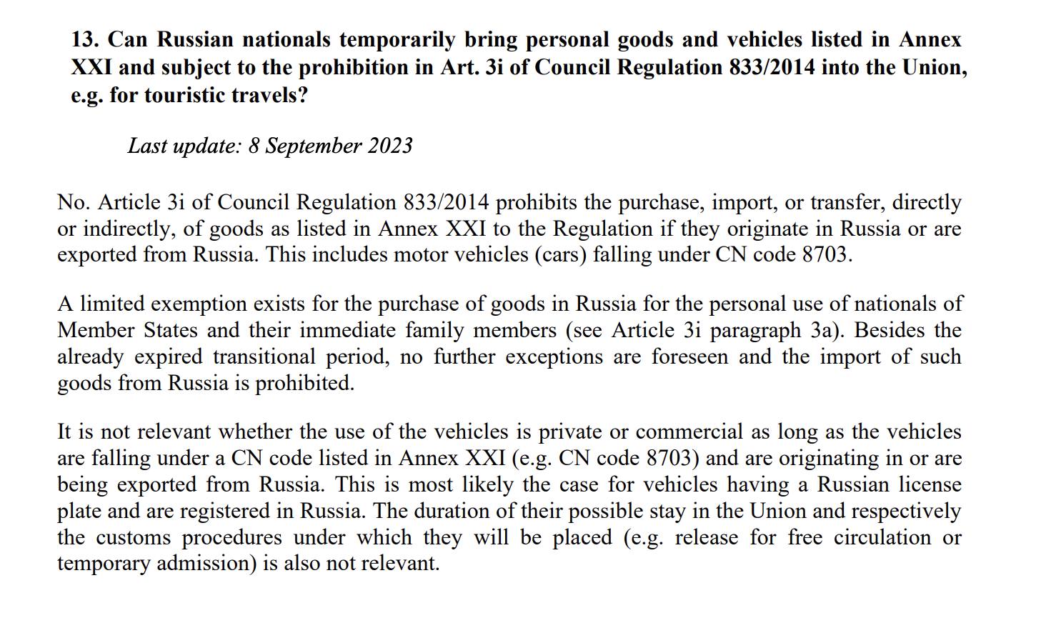 XXI и подпадают ли такие вещи под запрет в ст. 3i Регламента Совета 833/2014 в Союз, например для туристических поездок?Ответ: Нет. Статья 3i Регламента Совета ЕС 833/2014 запрещает непосредственную и косвенную покупку, импорт, передачу товаров, перечисленных в Приложении XXI к Регламенту, если они имеют российское происхождение или экспортированы из России. К таковым относятся автотранспортные средства (легковые автомобили), подпадающие под код CN 8703.