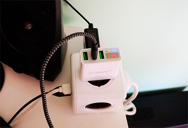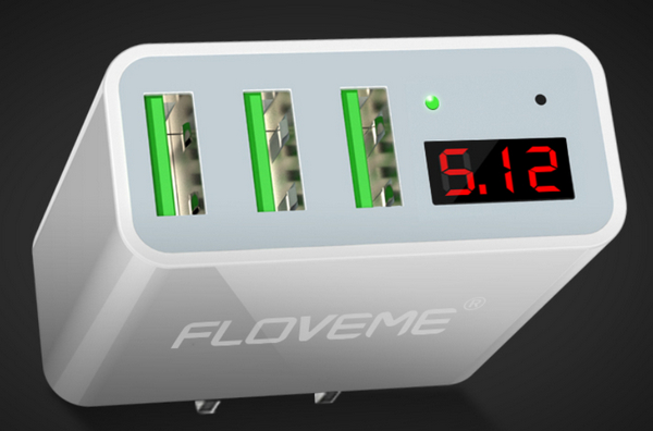 Посоветовали хорошего производителя всяких проводочков, зарядничков и прочей мелочевки - Floveme. Я там интересных универсальных проводочков заказал, но они еще не приехали. Зато приехало вот такое зарядное устройство на три порта и с дисплеем, на котором в реальном времени показывается напряжение и ток зарядки.