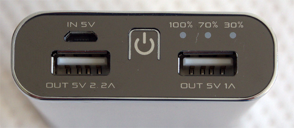 Конечно, для одного смартфона такая батарея не нужна, но для тех, кто в поездки берет с собой 2-3 телефона и планшет - штука крайне полезная. У аккумулятора есть два выхода на 1А и 2.2А. Выход на 2.2А предназначен для зарядки планшетов, выход на 1А - для смартфонов. Есть индикатор разрядки и кнопка включения. Заряжается аккумулятор от стандартного microUSB на 5V.