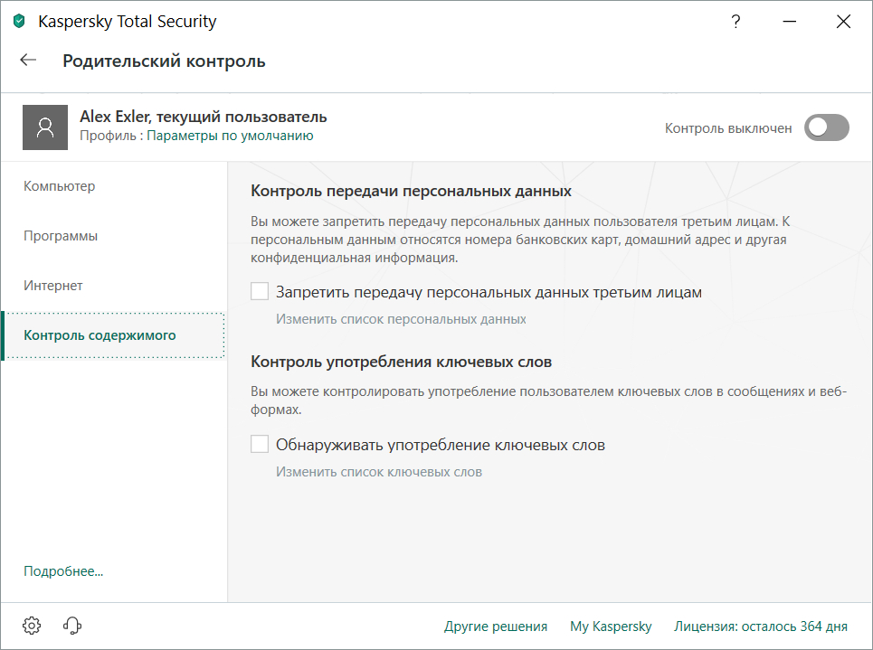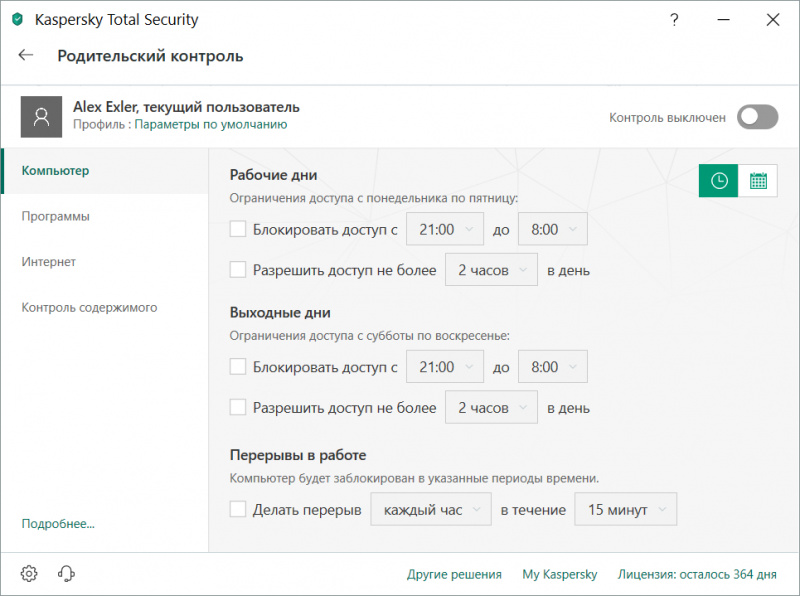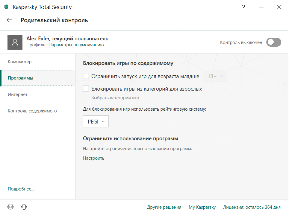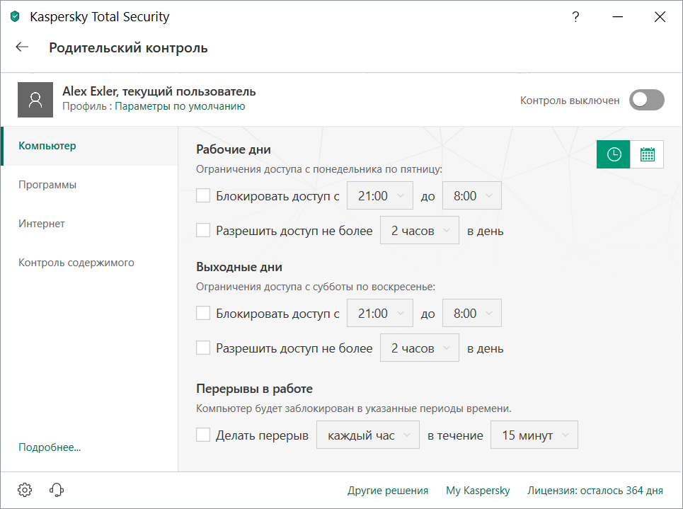 1) Ограничение по времени ИЛИ по длительности использования. Вот именно ИЛИ, но никак не И, что есть у многих программ, которые в остальном существенно уступают Касперу. Писал в техподдержку давным-давно - пока ответ из серии "мы вас услышали".